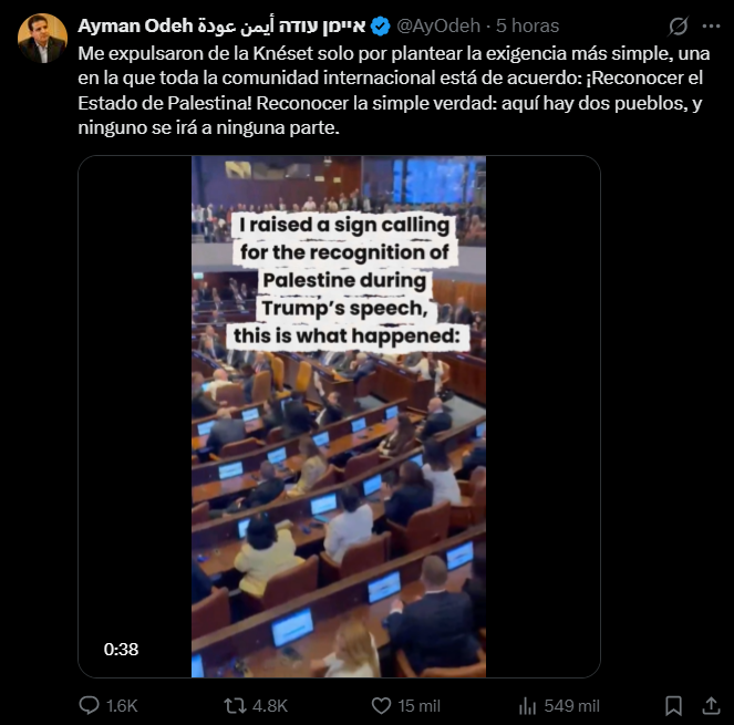 El discurso de Donald Trump ante la Knesset, el Parlamento israelí, terminó con un momento de tensión que recorrió el mundo. Mientras el presidente estadounidense hablaba sobre la paz en Medio Oriente, dos diputados del bloque de izquierda Hadash, Ayman Odeh y Ofer Cassif, se pusieron de pie, levantaron carteles con la frase “Reconozcan a Palestina” y gritaron “¡Genocidio!”. Segundos después, fueron expulsados de la sala por personal de seguridad.