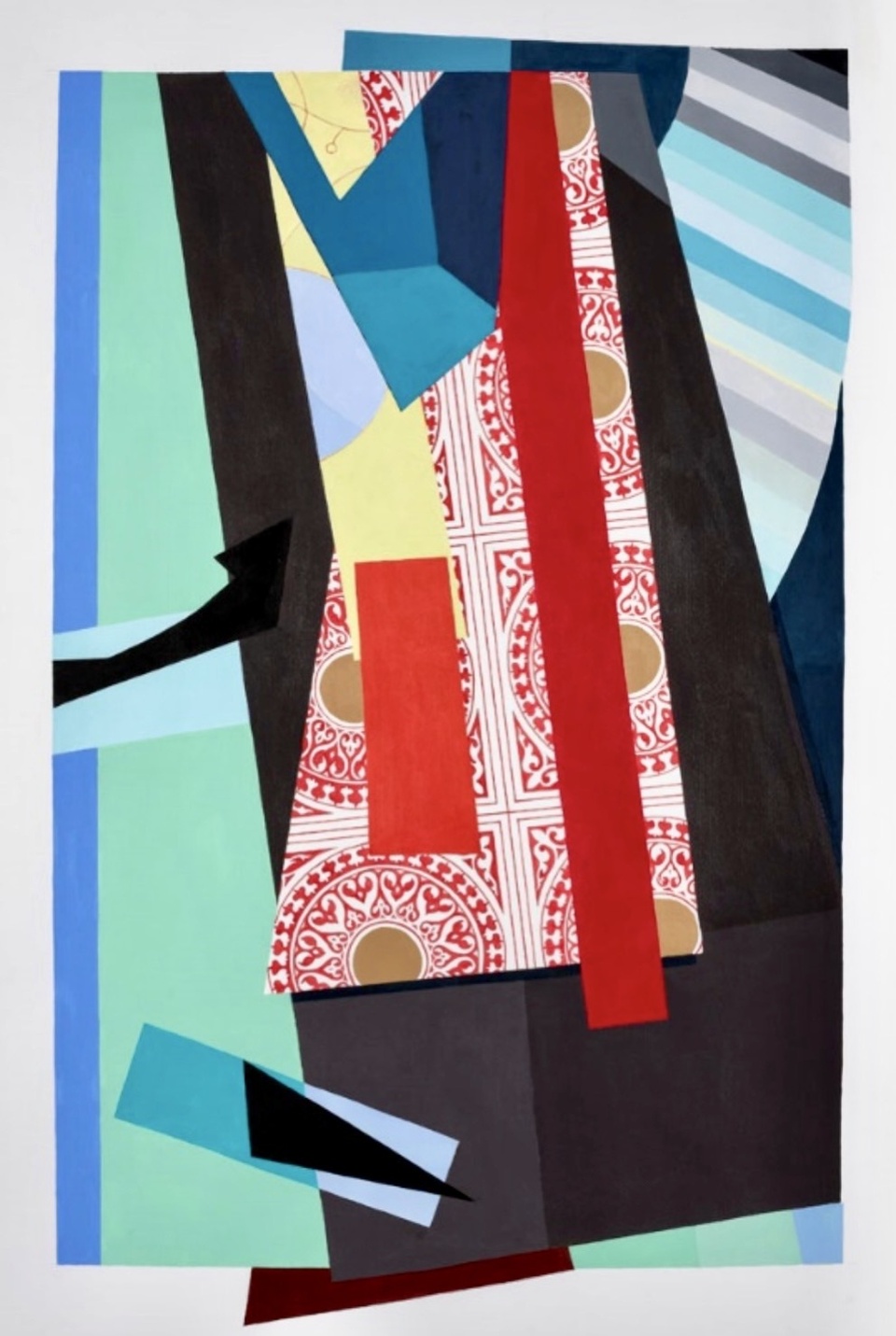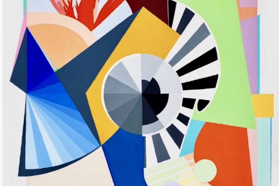 Del conjunto de obras exhibido, la serie predominante se llama “Kimono”, en referencia a la cultura gráfica japonesa. El resultado del primer paso de esta investigación son los pequeños collages. Una síntesis de éstos se activa en obras de mayor tamaño, materializadas en soporte de papel. Para la serie “2 x 4”, también derivada de los collages, la artista selecciona detalles y focaliza la mirada en recortes minúsculos. Ensambla formas geométricas sobrias con gráficas lineales y texturas barrocas que, ampliadas en gran escala, pinta con óleo sobre lienzo. Sus imágenes antidescriptivas niegan el relato. Trasformadas en poemas visuales convierten los elementos formales en expresiones poéticas transmitidas en el instante de un encuentro que parte de la idea de que el universo todo, está conectado.