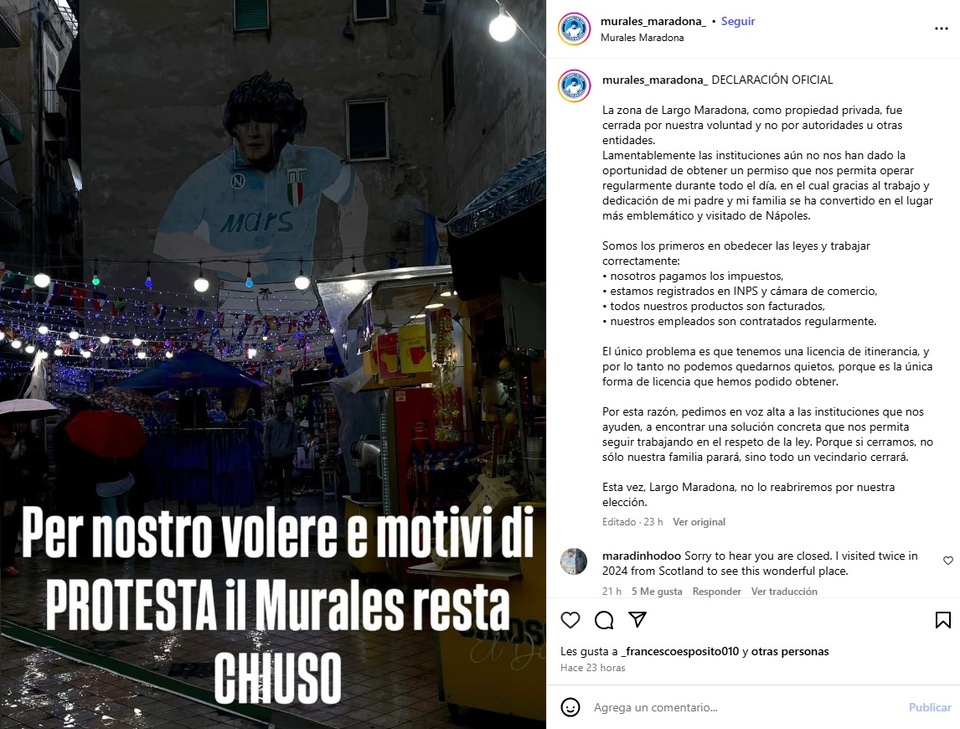 "Lamentablemente, las instituciones aún no nos han dado la oportunidad de obtener un permiso que nos permita operar regularmente durante todo el día, en el cual gracias al trabajo y dedicación de mi padre y mi familia se ha convertido en el lugar más emblemático y visitado de Nápoles", sostuvieron.