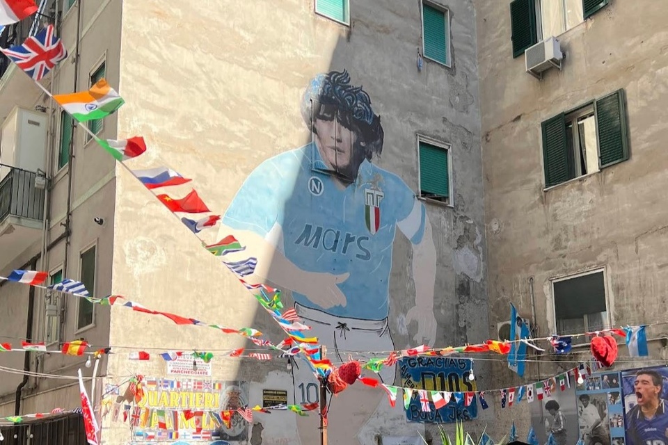El mural de "Pelusa" vestido con la camiseta del S. S. C. Napoli en el sitio conocido como "Largo Maradona" fue pintado en 1990 por el artista local Mauro Filardi en el corazón de la ciudad italiana, sobre la pared de un garage privado ubicado en Via Emanuele de Deo, para celebrar la conquista del segundo título de la liga italiana del club. La obra, no obstante, tuvo que ser restaurada en más de una oportunidad: una vez por la aparición de una ventana a la altura del rostro de Diego, y otra para retocar su rostro, trabajo que tuvo a cargo en 2017 del argentino Francisco Bosoletti.