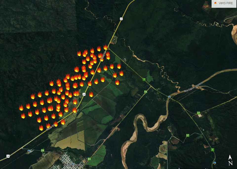 El principal se había conformado en la zona de Caimancito, en el departamento Ledesma, donde las llamas primero devoraron alrededor de 775 hectáreas en las inmediaciones del cruce entre la ruta provincial 1 con la nacional 34, pero luego ese frente se unió a otro, que había comenzado algo más al sur, en la intersección de la provincial 84 con la 34. Y en este último caso bordeó el límite del Parque Nacional Calilegua.