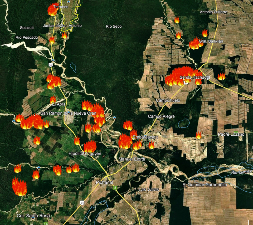 Sitios como Fire Nasa, daban cuenta con sus satélites de que los incendios forestales se extendían por distintos puntos del norte salteño, donde las llamas consumían hectáreas de bosques y pastizales, al menos sobre el norte de Colonia Santa Rosa, en el área de Zanja de Tigre por las inmediaciones de Embarcación; también, sobre la ruta provincial 18 que conduce a Isla de Cañas, en el área de Senda Hachada y por la nacional 50 pasando río Pescado, en camino a Aguas Blancas.