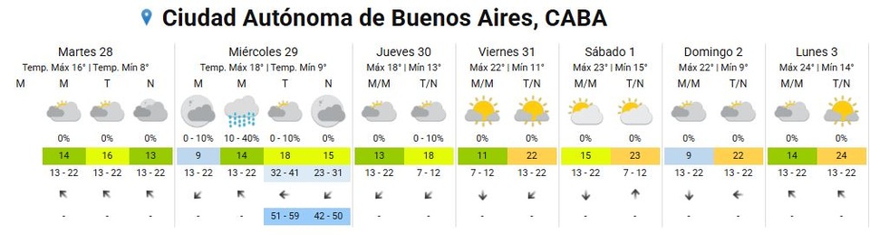 El miércoles la mínima será de 9 grados y la máxima de 18 grados, con lloviznas por la mañana, con viento del noreste rotando hacia el este, cielo mayormente nublado y ráfagas de hasta 50 kilómetros por hora a partir de la tarde.