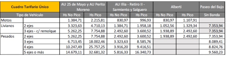 Los nuevos valores del Cuadro Tarifario Único de los peajes en la Ciudad de Buenos Aires quedaron establecidos desde este sábado de la siguiente manera: