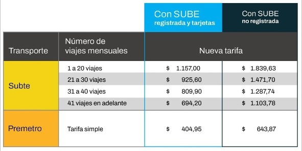 En el caso del Subte, se mantendrá el beneficio para pasajeros frecuentes (con descuentos del 20, 30 y 40 por ciento una vez superados los 20, 30 y 40 viajes respectivamente) y los descuentos de la Red SUBE. También continuarán los beneficios como pases y tarifas especiales, que ahora están integrados en la tarjeta SUBE (Pase Jubilados y Pensionados, Pase para Personas con Discapacidad, Pase para Personas Trasplantadas, Boleto Estudiantil, Tarifa Social, Tarifa Estudiantil y Tarifa Maestro).