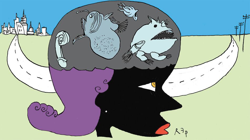 Vi pasar una ilustración muy simple que grafica dos estados de la mente: una cabeza delineada, de perfil, y dos conos en transparencias que parten