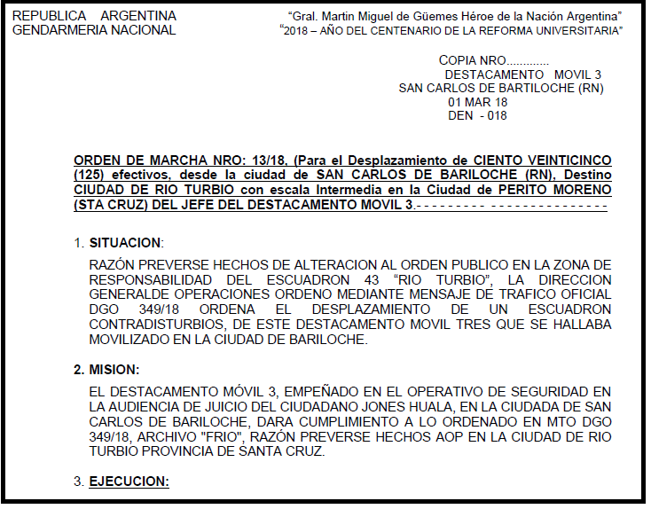 Según el Mensaje de Tráfico Oficial (MTO) 349/18 al que accedió Agencia Cadena del Sur, los uniformados desplazados estaban apostados en las inmediaciones del gimnasio donde se realizó el segundo juicio a Facundo Jones Huala, cuya sentencia se conocerá mañana.