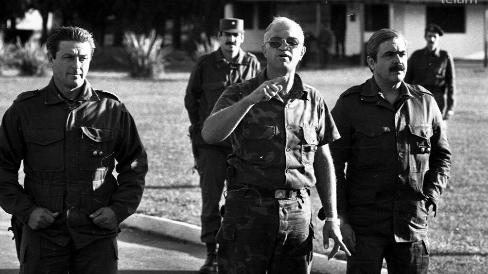 Abril de 1987 --Acá hice la colimba hace ocho años. Nuestro jefe de escuadrón era Camps. ¡Hoy ese nazi asesino está en cana y yo acá! --Qué país raro este, ¿no?