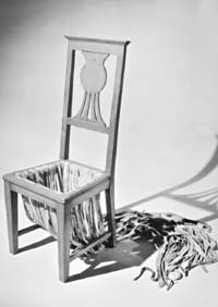 Otra de las piezas consiste en un silla desfondada, en la que las tiras exageradamente largas del asiento, caen y se extienden por el piso como una cola.
