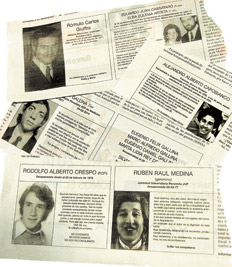 Página/12 es un diario. Que se lee con una clave. Porque si alguien no oyó hablar del terrorismo de Estado no entenderá por qué está permanentemente ilustrado con recuadros que encierran fotos con fechas y algún breve comentario interior. Un recuadro negro, un adentro con una o dos caras, a veces un grupo familiar, se enlazan con los avisos y las noticias sin que algunos entiendan la razón. Como quienes hacen Página/12 descuentan que distraídos e indiferentes también son sus lectores, se ocupan, como ningún otro periódico, de comentar temas de derechos humanos. Habrá quienes seguramente reconocen, reconocemos, la coherencia de esos artículos y de esas fotos, que nunca faltan. Otros, quizá muy jóvenes, pasan por alto esas imágenes y no faltará quien piense “¿por qué no la cortan con eso de las fotos?”.