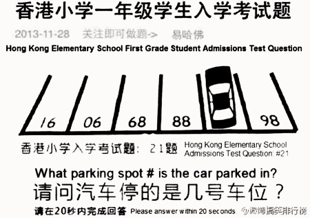 El 28 de noviembre del año 2013, un grupo de aspirantes a entrar en un colegio ¡primario! en Hong Kong tuvieron que pasar por una prueba de admisión. A nosotros nos resulta –creo– entre irritante/discriminatorio que niños tan pequeños tengan que ser sometidos a pruebas de este tipo. Sin embargo, le pido que no se apresure (como hice yo) a sacar conclusiones.