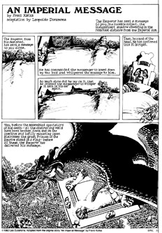Sin embargo, de toda la producción de aquellos años en el Norte –que incluyen largas series exitosas como Raza de Escorpiones– e incluso de todo lo que Leopoldo generó dentro de la historieta en sus distintas etapas, acaso no haya nada comparable a sus breves, cuidadas y originales adaptaciones de Kafka. Las versiones de Bajo la Ley y Un mensaje imperial, que datan de 1982, más Un médico rural y La ejecución –bajo cuyo título las reunió la prestigiosa Fantagraphics Books en 1989– están entre las mejores que se hayan realizado jamás.