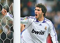 Con un gol del ex River Gonzalo Higuaín y otro de Raúl, de penal, Real Madrid se impuso ayer como local por 2-1 ante Espanyol, que se había puesto en ventaja un tanto del brasileño Valdo. El equipo Blanco continúa en la primera posición en la tabla y le sacó 8 a Barcelona, que mañana visita a Villarreal. En el otro adelantado de la 27ª fecha, Zaragoza, con un gol de Diego Milito, derrotó como local 2-1 al Atlético de Madrid.