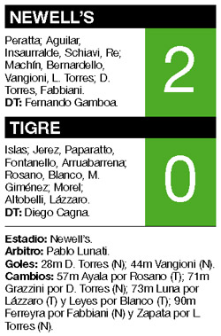 Con una sólida tarea colectiva en la que brilló especialmente Cristian Fabbiani, Ne- well’s le ganó 2-0 a Tigre y lo alcanzó en el segundo lugar del torneo, a cinco puntos de San Lorenzo. Diego Torres y Lionel Vangioni marcaron los goles rosarinos, ambos tras asistencias mágicas de Fabbiani.