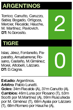 El puntero Tigre no pudo disfrutar de su visita a La Paternal, donde perdió frente a Argentinos por 2-0 y calentó así un poco más la definición del presente Apertura. El paraguayo Recalde, de tiro libre, abrió la cuenta para los locales y el defensor Canutto amplió la ventaja, todo en la primera parte. A pesar del traspié, el conjunto de Diego Cagna continúa liderando el certamen y ahora espera el resultado entre Boca y San Lorenzo para saber si conserva la posición, en caso de una victoria de Boca, o si termina como escolta, si es que San Lorenzo gana o empata.