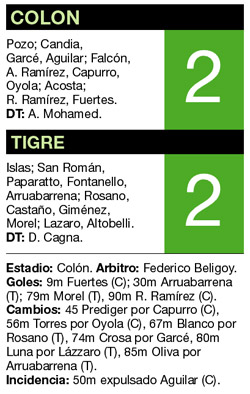 El desarrollo se hizo intenso. De ida y vuelta. Y pese a la expulsión de Aguilar, Colón no se desestabilizó, y tuvo las mejores chances de llegar al gol. Pero el que dio el primer golpe fue Tigre. Porque a diez minutos del final, un cabezazo de Morel les devolvió las esperanzas a los de Victoria, que con ese resultado volvían a asegurarse la punta por una semana más. Pero la felicidad duró poco. Porque ese duro golpe que había dado Tigre no había sido de nocaut. Colón se levantó, y con las últimas fuerzas que le quedaban fue en busca del empate. Y lo encontró con un toque de Ramírez tras un corner. Así le arrebató el triunfo a su rival, que perdió una gran chance de escaparse por mucho más.