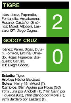 Tigre se quedó con tres puntos muy importantes para continuar prendido en la lucha por el campeonato. Con dos apariciones de su figura, Martín Morel, le ganó 2-0 a un complicado Godoy Cruz, que hizo todo para conseguir un mejor resultado pero se quedó con las manos vacías. Así, el conjunto de Diego Cagna volvió a conseguir un triunfo luego de dos jornadas, mientras que el equipo mendocino hace siete partidos que no gana y sigue hundido en la zona de descenso directo.