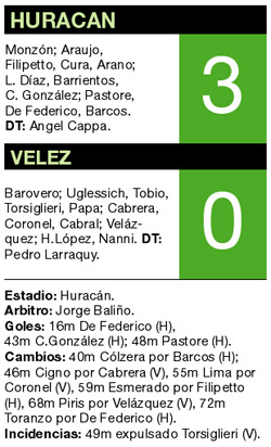 Con actuaciones descollantes, como la de Javier Pastore, autor de uno de los goles; una contundencia pocas veces vista en este torneo y pasajes en los cuales superó ampliamente al rival, Huracán se despidió del Apertura goleando a Vélez Sarsfield por 3-0. Matías De Federico, el venezolano César González, ambos en la primera etapa, y Pastore, en el complemento, fueron los autores de los goles del conjunto dirigido por Angel Cappa, que ayer volvió a jugar en el estadio Tomas A. Ducó, después de 438 días. Vélez, por su parte, terminó el partido con diez hombres, a raíz de la expulsión del defensor Marco Torsiglieri, a los 5 minutos del segundo tiempo.