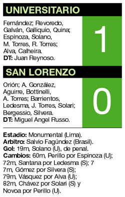 Aquel gol nació en un pelotazo largo para Calheira entre los dos zagueros centrales de San Lorenzo. El delantero acomodó la pelota al entrar al área para medirse con el arquero argentino, Bottinelli lo tocó de atrás y el árbitro brasileño Fagúndez marcó penal y roja. Solano, el alma del equipo peruano, remató alto y Orión alcanzó a desviarla aunque no pudo evitar que se colara.