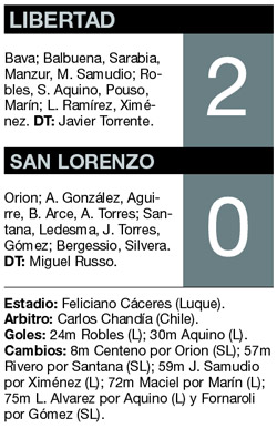 San Lorenzo no pudo repetir otra actuación como ante River y el equipo volvió a perder fuera del país en la Copa Libertadores. Sin juego asociado y sin ideas en ataque, los de Boedo fueron superados por un rival que intentó jugar siempre en el campo adversario. Los problemas para San Lorenzo comenzaron cuando Libertad se adueñó de la pelota en la mitad de la cancha. Entre Robles y Marín se encargaban de trasladarla por los laterales y de esa manera buscaban a los delanteros para el desequilibrio. Para colmo, la lesión de Orion obligó al ingreso del juvenil Centeno, quien terminó siendo clave por sus errores. Luego de un tiro de Ramírez, el joven dio un rebote hacia el medio y Robles llegó para empujar la pelota y marcar el primer gol.