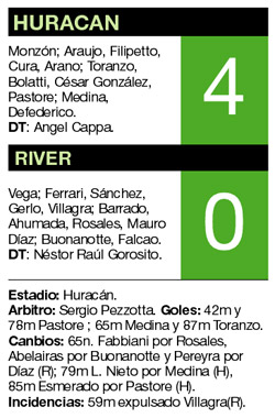 El partido se acabó a los 89 minutos porque Pezzotta se apiadó de River ante el papelón que padecía. O bien se podría asegurar que terminó antes, a los 20 minutos del segundo tiempo, cuando Medina tocó una pelota que viboreaba sobre la raya de gol. O quizás un rato antes, cuando Pastore clavó un derechazo cruzado con tres cosas a favor: el factor sorpresa, el viento y la tardía reacción de Vega. O cuando a River le echaron a Villagra. O tal vez un poquito antes todavía, cuando Huracán se dio cuenta de que la tarea de ablande sobre el ímpetu inicial de River ya estaba concluida y que sólo se trataba de persistir en el ataque. Y si se sigue retrocediendo hasta puede llegarse a la conclusión (con la chapa puesta, claro) de que no hubo partido y que todo estaba cocinado de antemano porque la realidad de ambos es muy distinta y el optimismo y la confianza de los pibes de Huracán es inversamente proporcional al desánimo y el pesimismo de los jugadores de River.