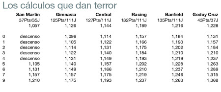 El caso de Godoy Cruz también es relativo. Con tres puntos saldrá de todo peligro. Pero en la medida que no los consiga, su futuro puede complicarse. Si saca sólo un punto, Gimnasia lo alcanzará con siete y Central con cinco. En el mano a mano le lleva seis unidades a San Martín. Sus adversarios serán Estudiantes en La Plata, River en Mendoza y Central en Rosario. Para Banfield, la cuenta es sencilla: cuatro puntos lo separan de olvidarse de la promoción. Si obtiene menos, entrará a hacer cuentas, aunque sabe que Gimnasia no puede alcanzarlo, por lo que no hay chances de descenso directo. Su fixture indica Independiente como local, Argentinos en La Paternal y Tigre en casa.