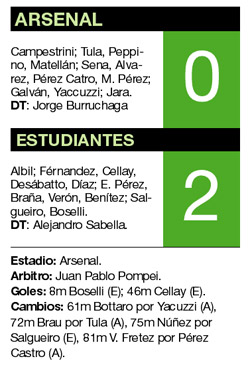Aunque no mostró lo mejor de su repertorio, Estudiantes logró vencer a Arsenal por 2-0 y tuvo un alentador arranque de campeonato. Con goles de Boselli y Cellay, el equipo platense mostró una leve superioridad ante el conjunto de Sarandí, pero fue contundente frente al arco de Campestrini y con eso le alcanzó para llevarse el triunfo.