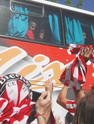 Con un gran despliegue de banderas, bombos y bengalas, miles de simpatizantes rodearon el micro de dos pisos que trasladó a la delegación del conjunto platense hasta Ezeiza y le impidieron tomar el camino General Belgrano por más de una hora, avanzando a paso de hombre.