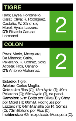 Tigre y Colón empataron 2-2 en un entretenido partido que dejó mucho más conformes a los santafesinos, que jugaron con suplentes y que terminaron el encuentro con diez hombres por la expulsión de Mosquera. Néstor Ayala, en dos ocasiones, uno de penal, marcó los tantos de Tigre, mientras que Andrés Ríos y Cristian Pellerano habían puesto en ventaja en sendas ocasiones a los visitantes.