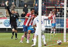 El seleccionado de Grecia, tercer rival de la Argentina en el grupo B del Mundial de Sudáfrica, perdió 2-0 ante Paraguay, en un amistoso llevado a cabo en Wintherthur, Suiza. Enrique Vera, a los 8 minutos, y el argentino nacionalizado paraguayo Lucas Barrios, a los 24, fueron los goleadores del seleccionado dirigido por el rosarino Gerardo Martino. Para ambas selecciones, el de ayer fue el último amistoso, antes de debutar en el Mundial de Sudáfrica. El seleccionado griego, como sucede desde la llegada del entrenador alemán Otto Rehhagel, se mostró aguerrido, aunque carente de un juego claro para llegar con peligro sobre el arco defendido por Justo Villar. El equipo que presentó Rehhagel formó con: Alexandros Tzorvas; Sodratis Papadopoulos, Vasileios Torosidis, Sotirios Kyrgiakos (Loukas Vyntra); Georgios Seitaridis, Sotiris Ninis (Dimitrios Salpingidis), Constantinos Katsouranis (Nikolaos Spyropoulos), Alexandros Tzziolis (Sotirios Kyrgiakos); Georgios Samaras, Pantelis Kapetanos (Georgios Karagounis) y Dimitrios Salapingidis. Mientras que Martino paró a su equipo con: Justo Villar; Carlos Bonet (Antolín Alcaraz), Paulo Da Silva, Darío Verón (Jonathan Santana), Claudio Morel (Denis Caniza); Enrique Vera (Edgar Barreto), Víctor Cáceres, Christian Riveros (Néstor Ortigoza), Aureliano Torres; Lucas Barrios (Edgar Benítez), Roque Santa Cruz.