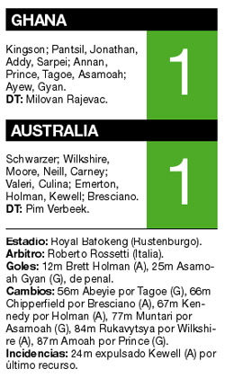 Los seleccionados de Ghana y Australia igualaron ayer 1-1 por la segunda fecha del Grupo D. El seleccionado australiano –que se quedó con diez jugadores por la expulsión de Kewell– ganaba con gol de Holman, pero los africanos alcanzaron el empate por medio de Gyan, de penal, ambos en el primer tiempo. Con este resultado el conjunto africano se instaló como líder de su zona con cuatro puntos, por delante de Alemania (3), Serbia (3) y su rival de hoy (1). El encuentro se disputó en el estadio Royal Bafokeng, de Rustenburgo, bajo el regular arbitraje del italiano Roberto Rossetti.
