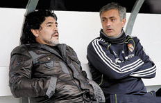 Diego Maradona aprovechó su estadía en España para visitar el entrenamiento del Real Madrid, donde estuvo dialogando con el DT, José Mourinho, y con los jugadores argentinos Angel Di María, Gonzalo Higuaín y Ezequiel Garay. Maradona aprovechó un entrenamiento público del conjunto madridista y durante quince minutos estuvo charlando con el técnico portugués, mientras los futbolistas seguían practicando. Tras el encuentro, Maradona elogió a Mourinho. “Deja a los jugadores que se diviertan, pero cuando hay que poner mano dura, pone mano dura. Y cuando hay que poner al equipo en la cancha, lo sabe hacer mejor que nadie”, remarcó el astro, que vaticinó un derby Barcelona-Real Madrid “muy parejo” la próxima semana.