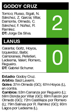Godoy Cruz volvió al triunfo en Mendoza. Desde la 15ª fecha del torneo Apertura, cuando superó a Banfield 2-1, que no lo hacía. Y ayer se recuperó. Venció 2-0 a Lanús con tantos de Olmedo y Hoyos en contra, para alcanzar los diez puntos en el Clausura. Así, llegará de la mejor forma al choque por la Copa Libertadores del próximo miércoles ante Independiente. Por su parte, los dirigidos por Gabriel Schurrer no levantan cabeza y suman su tercera caída al hilo como visitante.