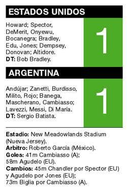 Con ese panorama, lo único que le faltaba a Argentina para completar una labor de alto vuelo era el gol. Y el tanto llegó con la fórmula elegida desde los vestuarios: los volantes manejaron la pelota hasta que Lavezzi lo buscó a Messi –adelantado–, que llegó hasta el fondo y envió un centro bajo que Di María conectó como pudo y que Howard rechazó. Con los ojos bien abiertos, Cambiasso capturó el rebote y definió arriba, para evitar cualquier pierna inesperada.
