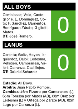 All Boys, que sigue en zona de Promoción e hizo los méritos para quedarse con los tres puntos, empató ayer con Lanús 0-0, como local. El equipo de Floresta cortó una racha de cuatro derrotas seguidas, pero llegó a los 573 minutos sin goles a favor.