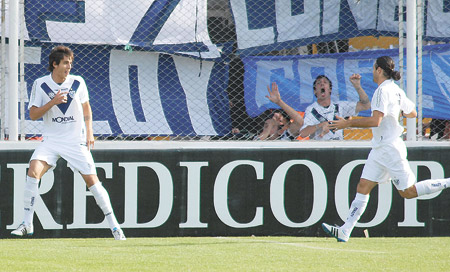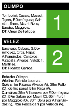 Ricky Alvarez festeja su gol, al minuto de juego, con el Burrito Martínez.Vélez dio ayer una nueva muestra de su recuperación y se consolidó como candidato a dar pelea por la corona, al vencer como visitante a Olimpo de Bahía Blanca por 2-1 en encuentro de la octava fecha del torneo Clausura de fútbol de Primera División. Ricardo Alvarez, al minuto del primer tiempo, y Emiliano Papa, a los 51, marcaron los goles para Vélez; Martín Rolle, a los 39, de penal, había marcado el empate transitorio para los de Omar De Felippe, quien ayer recibió un homenaje en su condición de veterano de la Guerra de Malvinas.