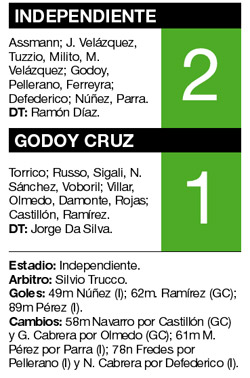 Independiente venció 2-1 a Godoy Cruz, con un gol anotado por el colombiano Marco Pérez sobre la hora, para darle tranquilidad al cuerpo técnico de Ramón Díaz, luego de la eliminación en la Copa Sudamericana. Leonel Núñez había abierto el marcador, pero Rubén Ramírez, el goleador del campeonato, señaló la transitoria igualdad con una carambola.