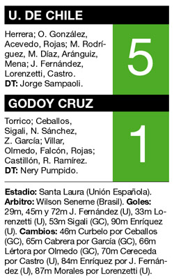 Universidad de Chile goleó anoche a Godoy Cruz por 5-1 y logró su primer triunfo en el Grupo 8 de la Copa Libertadores, alcanzando al conjunto dirigido por el ex arquero Nery Pumpido en la tabla de posiciones. Junior Fernández, la figura del encuentro, en tres oportunidades, Gustavo Lorenzetti y el juvenil Angelo Enríquez marcaron los goles del conjunto trasandino, que pudo haber conseguido una diferencia más amplia de no mediar la buena labor de Sebastián Torrico.