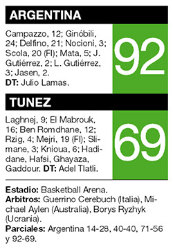 Una desventaja de 14 puntos al finalizar el primer cuarto y la ausencia del base titular Pablo Prigioni por cálculos renales pintaban un panorama oscuro para la Selección Argentina de básquetbol en su enfrentamiento con Túnez. Sin embargo, el liderazgo de Emanuel Ginóbili en el segundo parcial para encabezar la remontada, el aporte de Luis Scola, la efectividad de Delfino en los lanzamientos de media distancia y la más que interesante labor de Facundo Campazzo, el reemplazante de Prigioni, en la conducción, se encargaron de cambiar el desarrollo y llegar a un triunfo cómodo 92-69 sobre el campeón africano.
