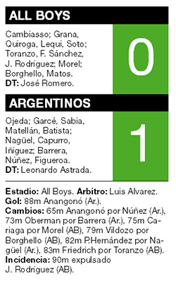 La ecuación era simple: mete gol, gana, como en los picaditos del barrio. Y el que convirtió sobre el final del encuentro fue el ecuatoriano Anangonó, para darle el triunfo 1-0 a Argentinos sobre All Boys en Floresta. Con los tres puntos, el conjunto de La Paternal alcanzó las 11 unidades y se acomodó entre los primeros puestos, mientras que All Boys, que no perdía como local hace nueve encuentros, continúa con apenas seis y está en el fondo de la tabla.