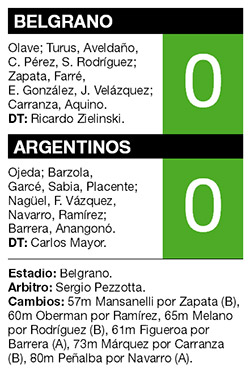 Belgrano desperdició ayer la oportunidad de alcanzar la punta del torneo Inicial al igualar sin goles con Argentinos, en su estadio de Barrio Alberdi. Con el empate, el conjunto que dirige Ricardo Zielinski cortó una racha de cuatro victorias consecutivas como local, suma 26 puntos y sigue prendido en la lucha por el campeonato. Del otro lado, Argentinos, que presentó a Carlos Mayor como DT interino tras la renuncia de Leonardo Astrada, acumuló su segundo empate al hilo. Además, el elenco de La Paternal sumó la séptima fecha sin triunfos y sigue en la mitad de la tabla, con 15 unidades.