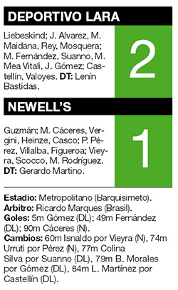 Newell’s sufrió una sorpresiva derrota 2-1 en su visita a Deportivo Lara de Venezuela, en un partido correspondiente a la segunda fecha del Grupo 7 de la Copa Libertadores. Los goles del ganador fueron anotados por Jesús Gómez y Marlon Fernández, mientras que Marcos Cáceres anotó para los rosarinos cuando se jugaba tiempo de descuento. Con este resultado, Newell’s mantiene tres puntos en la tabla de posiciones, al igual que su rival, Universidad de Chile y Olimpia de Paraguay.