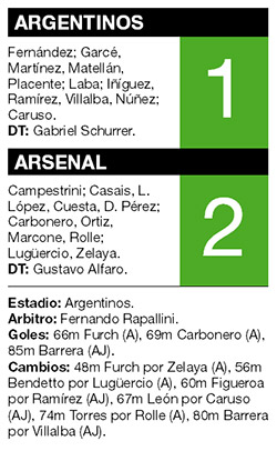 Luego de dos empates, Arsenal consiguió su primer triunfo en el campeonato tras imponerse 2-1 ante Argentinos, que aún no sumó puntos en el certamen. Su entrenador, Gabriel Schurrer, camina por la cuerda floja. En la primera etapa, el equipo de La Paternal, con poco, se mostró más dominador. Leonel Núñez fue el hombre más peligroso y tuvo dos chances claras con sendos remates desde afuera del área, uno de ellos se estrelló en el palo. Mientras tanto, el visitante no hacía pie y se encontraba casi siempre, salvo apariciones del colombiano Carlos Carbonero, lejos del arco rival.