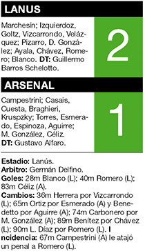A Lanús no le pesó la responsabilidad de tener que ganar para recuperar la punta del torneo Final. Con una actuación muy sólida, en la que sólo por un ratito perdió el control del juego, el equipo de Guillermo Barros Schelotto venció 2-1 a Arsenal y volvió a colocarse como único líder.