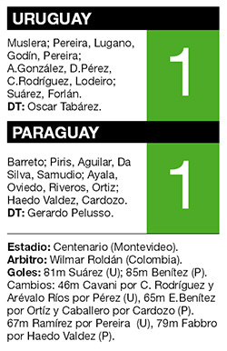 Uruguay y Paraguay redondearon en la noche de ayer un empate 1-1 en el Estadio Centenario de Montevideo que les dejó sabor a poco a los dos equipos porque no les permitió levantar cabeza en las Eliminatorias su-damericanas para el Mundial de Brasil 2014. Luis Suárez puso en ventaja a los uruguayos, a los 81 minutos de juego, pero cuatro minutos más tarde, Edgard Benítez anotó la igualdad para los paraguayos, tras un grueso error del defensor celeste Diego Lugano, quien despejó para atrás una pelota y terminó habilitando al paraguayo.