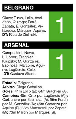 Belgrano y Arsenal protagonizaron un empate que fue ganando en emoción con el correr de los minutos y terminó siendo electrizante en los instantes finales. Luciano Lollo y Diego Braghieri anotaron los goles.