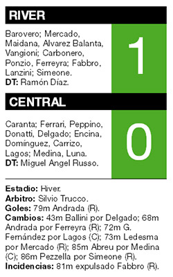 Sin el goleador comprado, el juvenil de las Inferiores que estaba entre los suplentes le dio la victoria a un River nervioso y confundido. Federico Andrada, con un cabezazo, tuvo su ingreso soñado y anotó el único tanto con el que River le ganó a un Central intenso y agresivo.