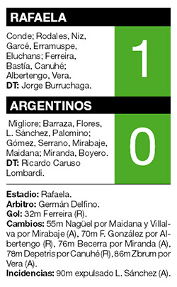 Rafaela sumó su tercer triunfo consecutivo y quedó a cuatro puntos del líder Newell’s, al vencer ayer de local 1-0 a Argentinos, que hilvanó su quinto partido seguido sin victorias. El gol del conjunto que dirige Jorge Burruchaga lo convirtió el volante Diego Ferreira, a los 32 minutos del primer tiempo. Rafaela, con la victoria (quinta en seis partidos como local), llegó a 19 puntos, cuatro menos que Newell’s; mientras que Argentinos, que terminó con 10 jugadores por la expulsión del defensor Leonardo Sánchez a los 46 minutos del complemento, se quedó con 14 unidades y continúa comprometido con el promedio.