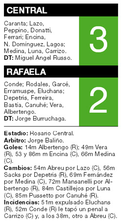 El partido no venía bien para Central, que era superado en el juego por Atlético de Rafaela y sentía la presión de sus propios hinchas en el Gigante de Arroyito. Los santafesinos saboreaban la victoria, en el arranque del complemento estaban 2-0 arriba, con goles de Albertengo y Vera, de penal, pero un error infantil de Eluchans terminó en penal y expulsión. El arquero Conde tapó el remate de Carrizo –sobre todo le tapó otro a Abreu–, pero la defensa se durmió y Encina terminó aprovechando un centro perfecto al corazón del área chica para descontar. El resto fue puro ímpetu y el saber aprovechar la ventaja numérica. Así llegó el empate de Medina y, tras el penal fallido del goleador uruguayo, el segundo de Encima, para darle la tercera victoria consecutiva al equipo de Miguel Angel Russo.