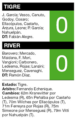 River no pudo repetir la actuación que tuvo ante San Lorenzo y apenas empató sin goles ante Tigre, en Victoria. Con este resultado, el equipo no logró acercarse al lote de equipos que se encuentran cerca de la punta y ahora suma ocho puntos. Pero, por sobre todo, su fútbol todavía continúa en deuda para aspirar a más.